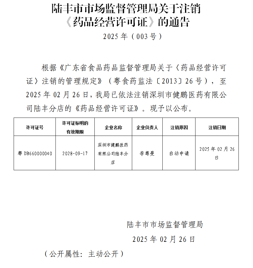 陸豐市市場監(jiān)督管理局關(guān)于注銷《藥品經(jīng)營許可證》的通告
