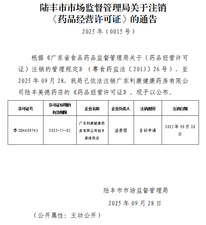 陸豐市市場監(jiān)督管理局關(guān)于注銷《藥品經(jīng)營許可證》的通告