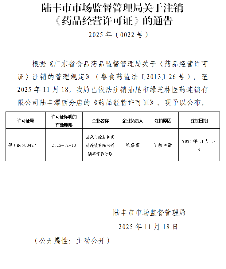 陸豐市市場(chǎng)監(jiān)督管理局關(guān)于注銷(xiāo)《藥品經(jīng)營(yíng)許可證》的通告