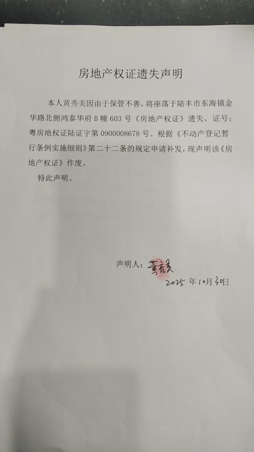 遺失聲明:本人黃秀美因由于保管不善,將座落于陸豐市東海鎮(zhèn)金華路北側(cè)鴻泰華府B幢603號《房地產(chǎn)權(quán)證》遺失,證號:粵房地權(quán)證陸證字第0900008678號。根據(jù)《不動產(chǎn)登記暫行條例實(shí)施細(xì)則》第二十二條的規(guī)定申請補(bǔ)發(fā),現(xiàn)聲明該《房地產(chǎn)權(quán)證》作廢。