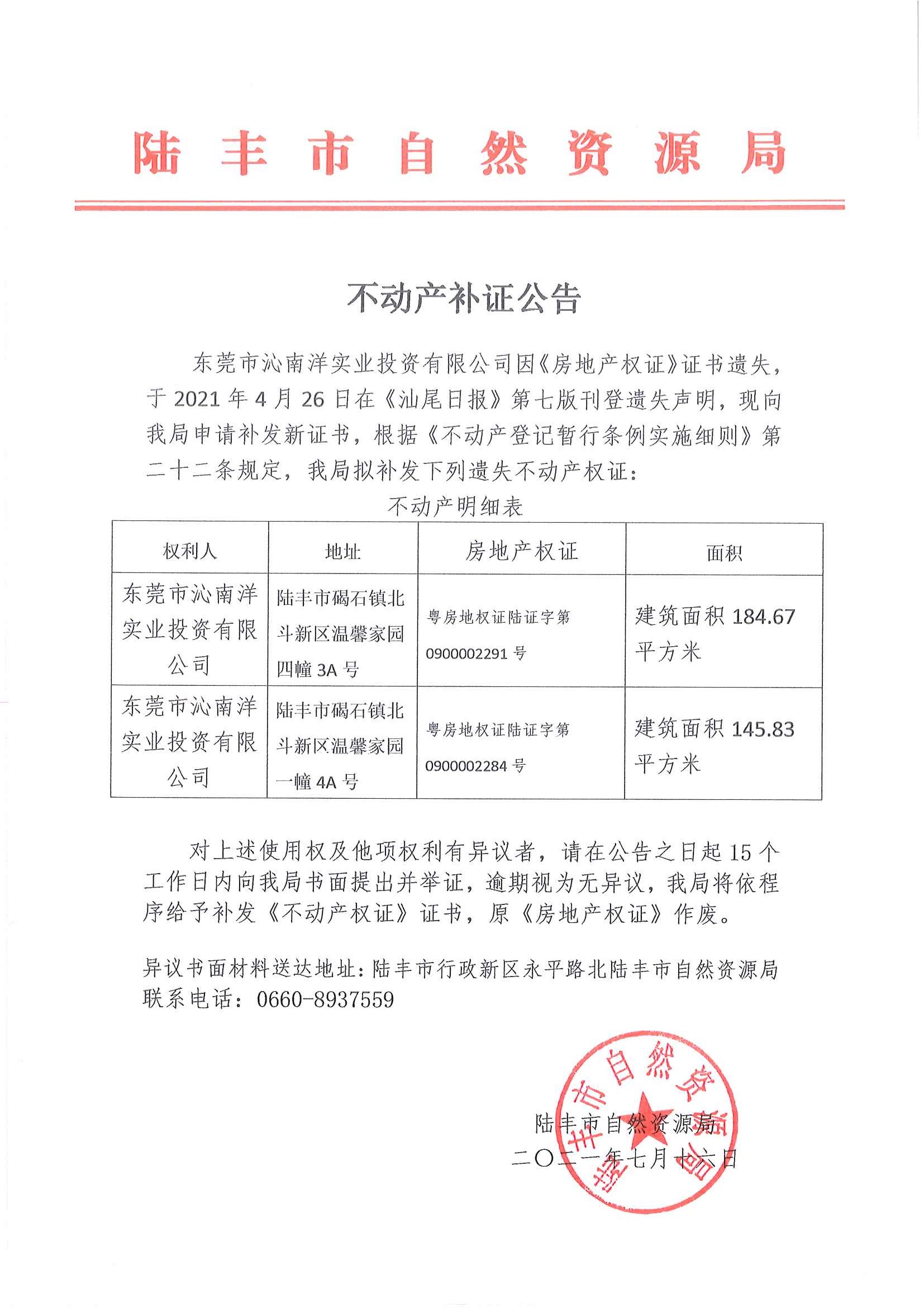 不動產(chǎn)補(bǔ)證公告(東莞市沁南洋實業(yè)投資有限公司)