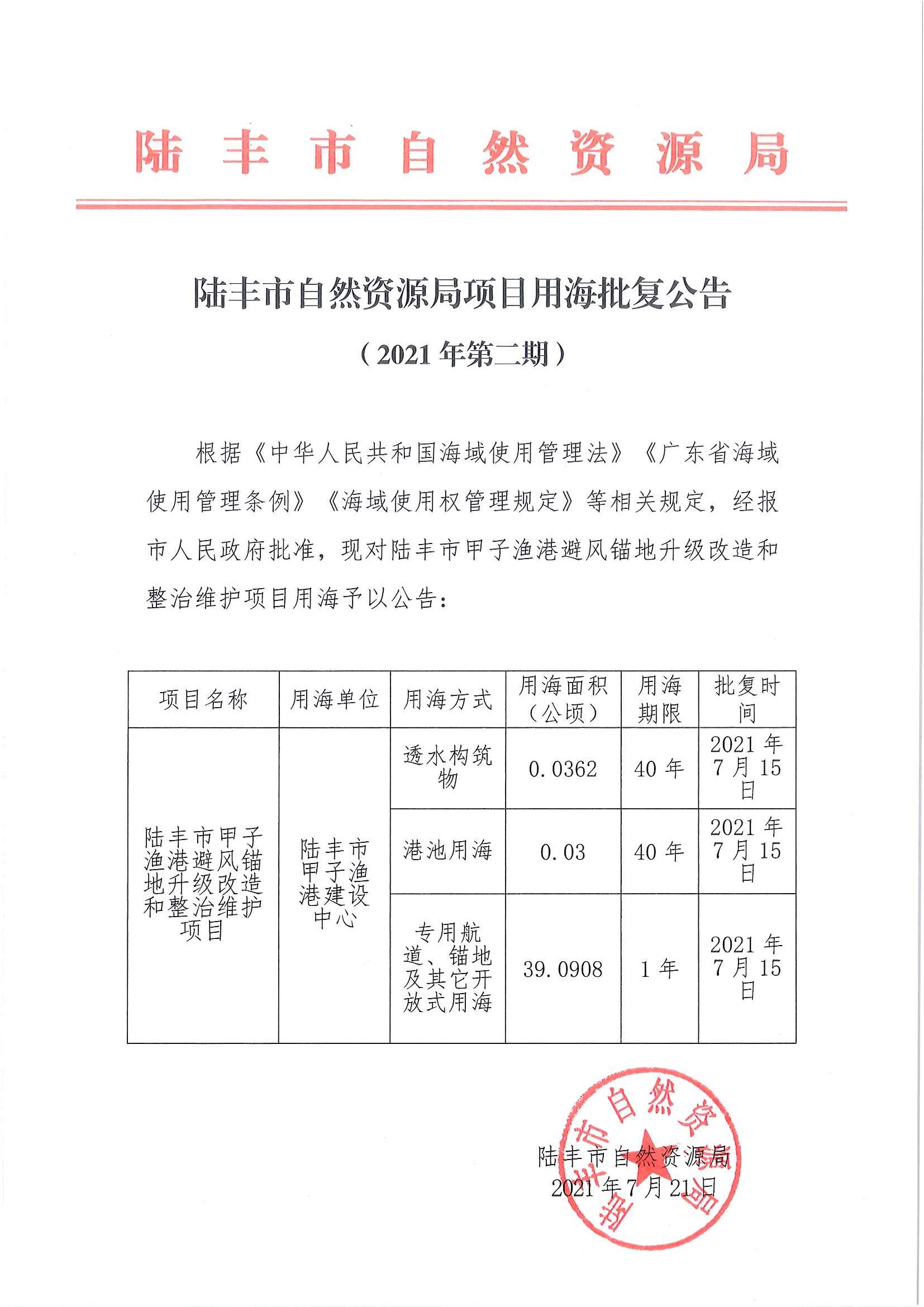 陸豐市自然資源局項(xiàng)目用海批復(fù)公告(2021年第二期)