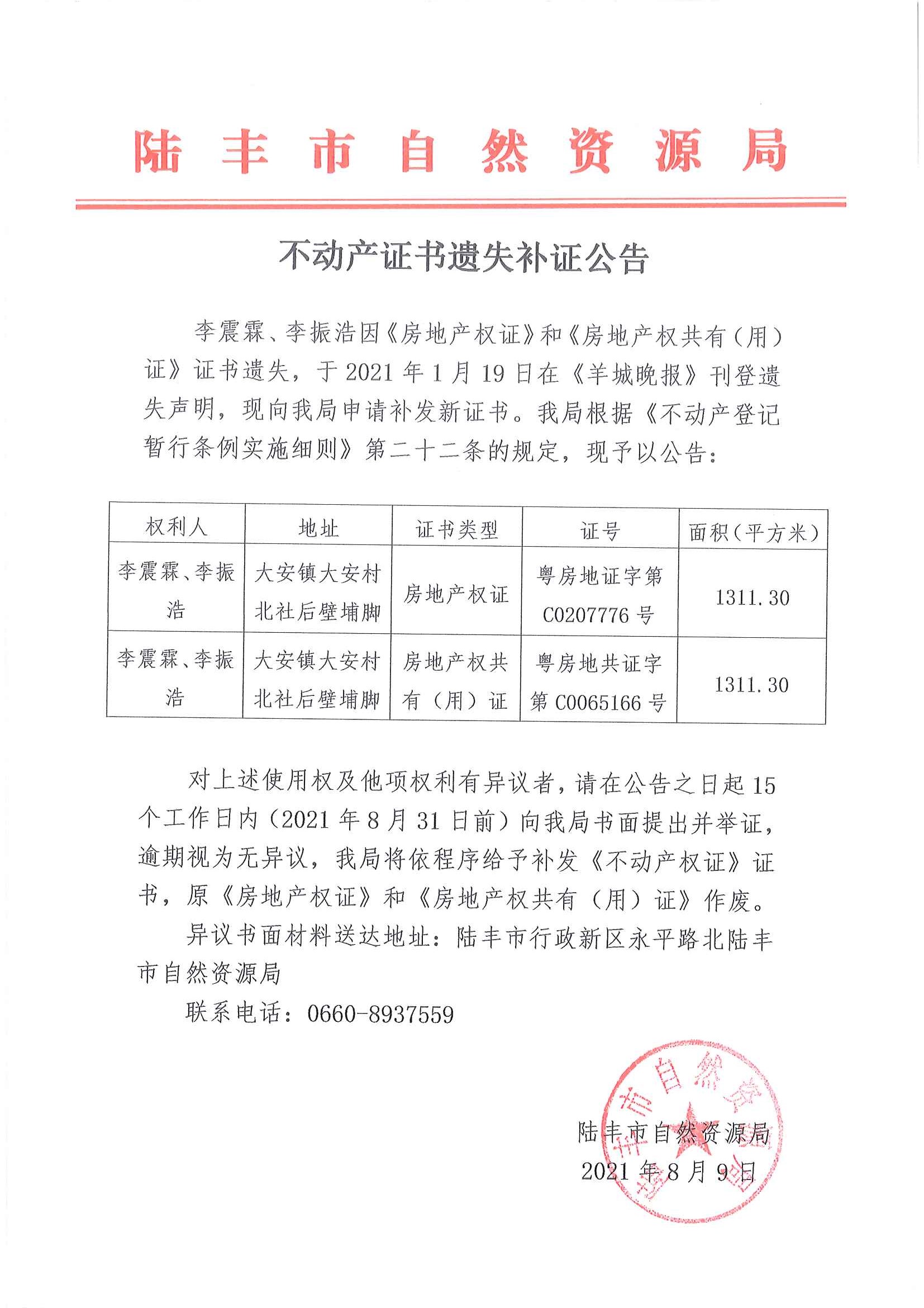 不動(dòng)產(chǎn)證書遺失補(bǔ)證公告(李震霖、李振浩)