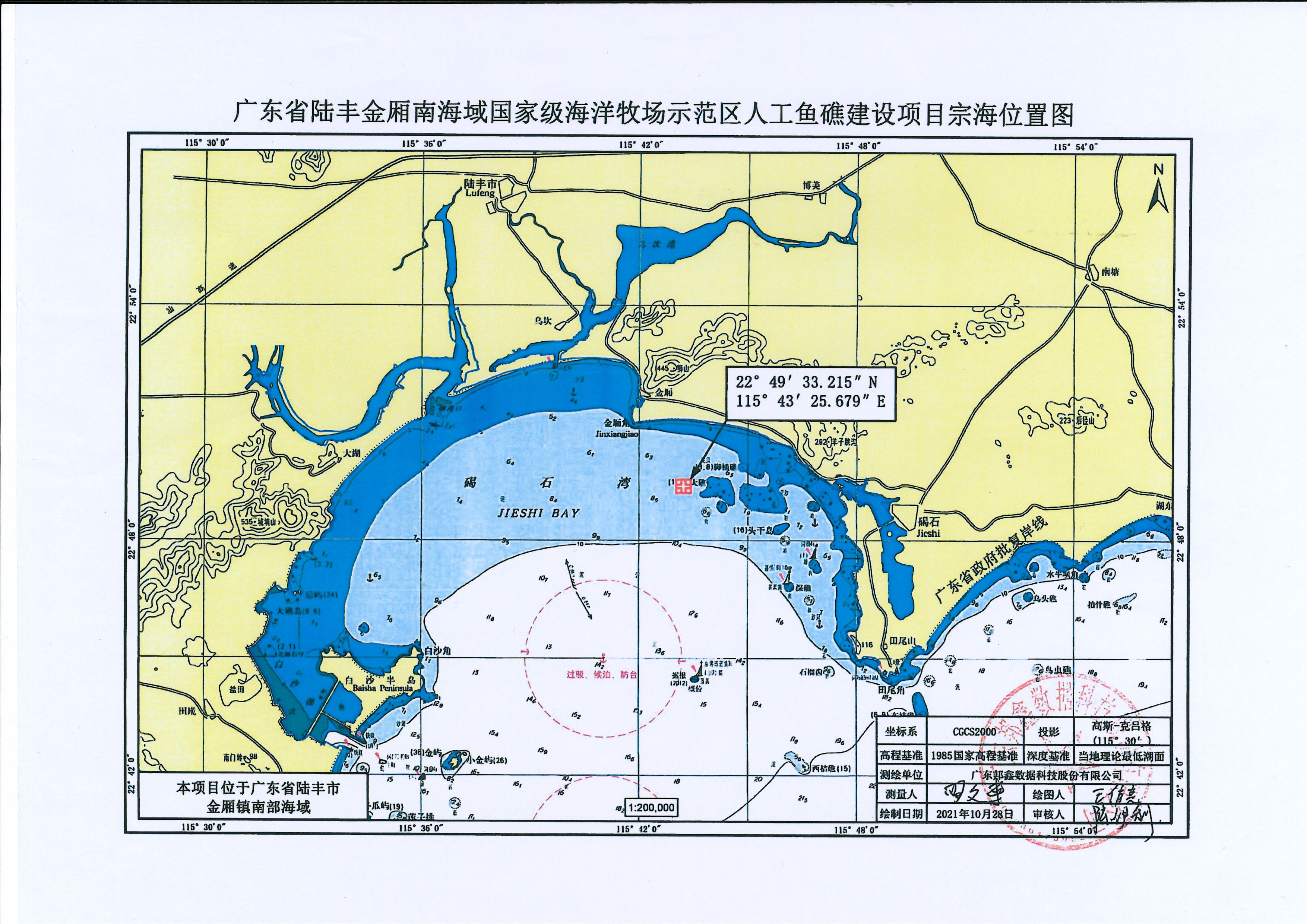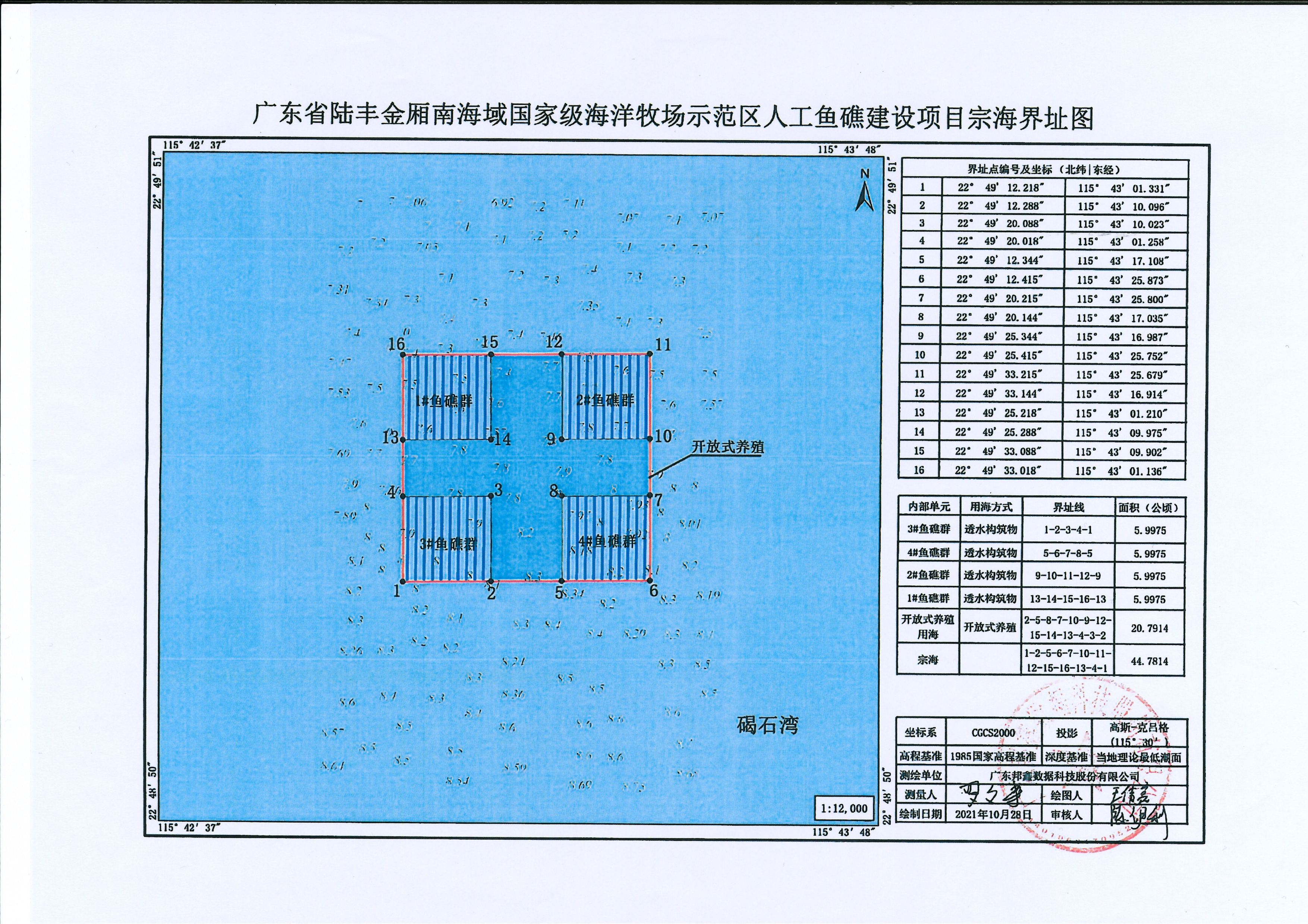 一、廣東省陸豐金廂南海域國(guó)家級(jí)海洋牧場(chǎng)示范區(qū)人工魚(yú)礁建設(shè)項(xiàng)目在陸豐市金廂鎮(zhèn)南側(cè)海域廣東省陸豐金廂南海域國(guó)家級(jí)海洋牧場(chǎng)示范區(qū)內(nèi)擬申請(qǐng)使用海域,用海總面積44.7814公頃,其中透水構(gòu)筑物用海(礁體)面積23.99公頃,開(kāi)放式養(yǎng)殖用海面積20.7914公頃。用海類(lèi)型為漁業(yè)用海中的人工魚(yú)礁用海和開(kāi)放式養(yǎng)殖用海,使用方式為透水構(gòu)筑物用海和開(kāi)放式養(yǎng)殖用海。本項(xiàng)目申請(qǐng)用海使用年限為40年,具體界址點(diǎn)及坐標(biāo)見(jiàn)附表。