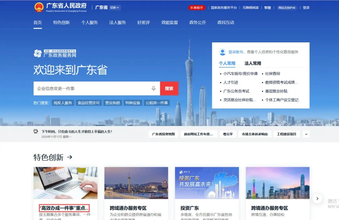 登錄廣東政務(wù)網(wǎng),點(diǎn)擊首頁“高效辦成一件事”服務(wù)專區(qū)