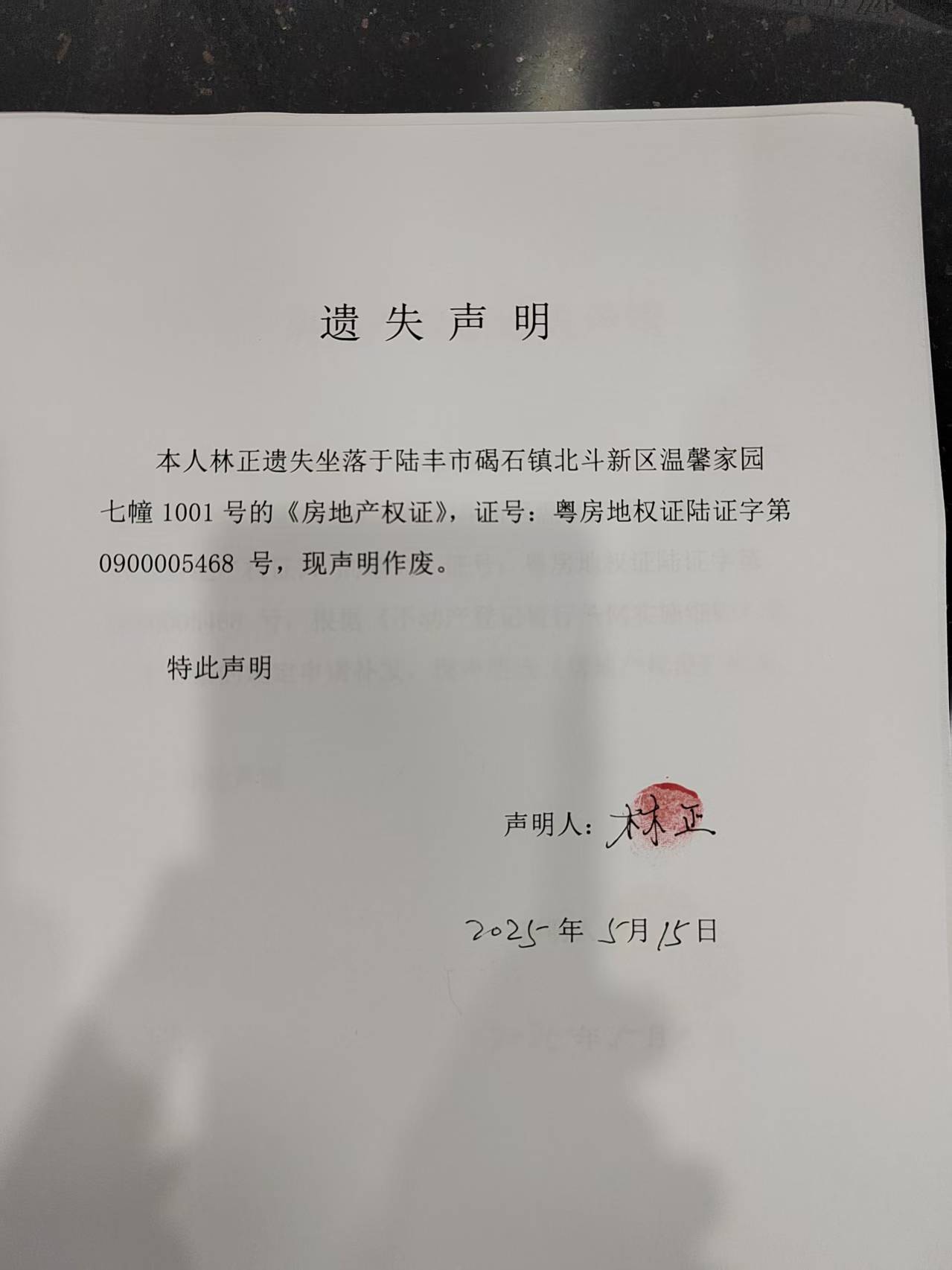 遺失聲明:本人林正遺失坐落于陸豐市碣石鎮(zhèn)北斗新區(qū)溫馨家園七幢1001號的《房地產(chǎn)權證》,證號:粵房地權證陸證字第0900005468 號,現(xiàn)聲明作廢。
