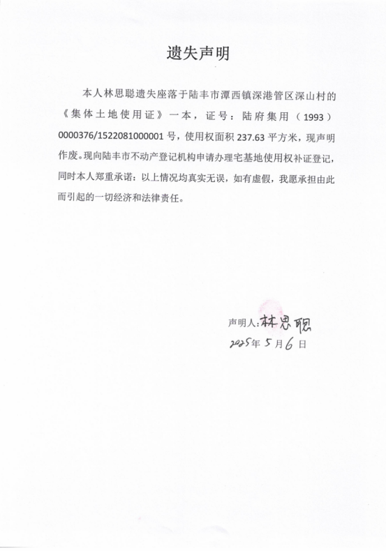 林思聰因遺失下列《集體土地使用證》向我局申請補發(fā)證登記,根據(jù)《不動產(chǎn)登記暫行條例實施細則》第二十二條的規(guī)定,現(xiàn)公告作廢。