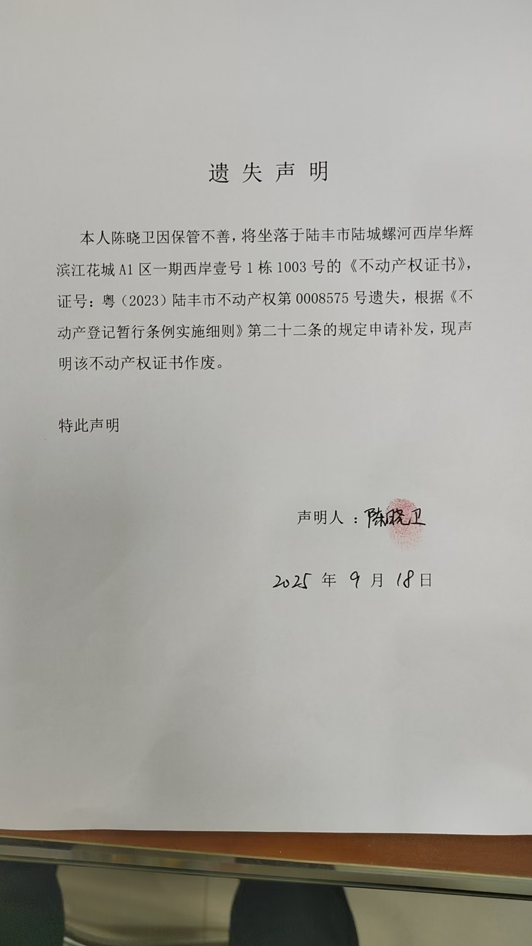 本人陳曉衛(wèi)因保管不善,將坐落于陸豐市陸城螺河西岸華輝濱江花城A1區(qū)一期西岸壹號(hào)1棟1003號(hào)的《不動(dòng)產(chǎn)權(quán)證書(shū)》,證號(hào):粵(2023)陸豐市不動(dòng)產(chǎn)權(quán)第0008575號(hào)遺失,根據(jù)《不動(dòng)產(chǎn)登記暫行條例實(shí)施細(xì)則》第二十二條的規(guī)定申請(qǐng)補(bǔ)發(fā),現(xiàn)聲明該不動(dòng)產(chǎn)權(quán)證書(shū)作廢。
